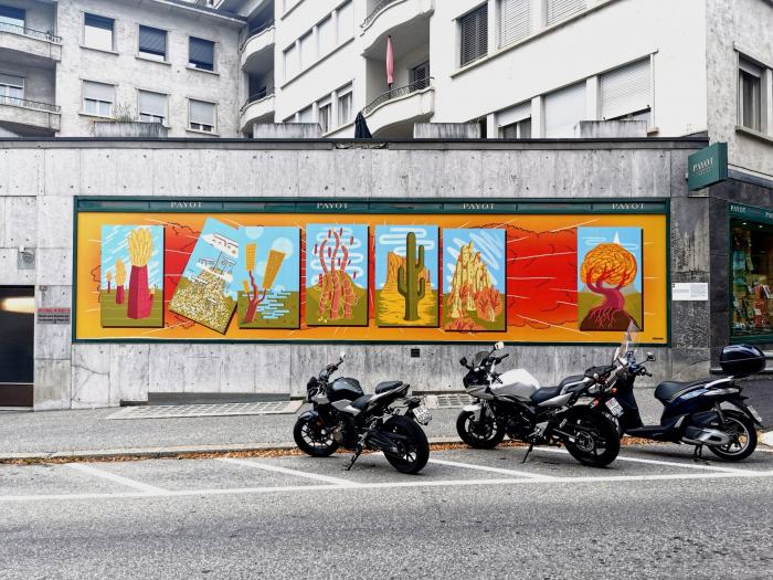 L’artiste et illustrateur Mathias Forbach, actif sous le pseudonyme Fichtre, expose Fichtrorama 1 sur la façade de Payot Sion, dès le 5 juillet. Pensé sous la forme d’un myriorama, ce travail entretient un rapport étroit avec la nature, les plantes et le voyage.