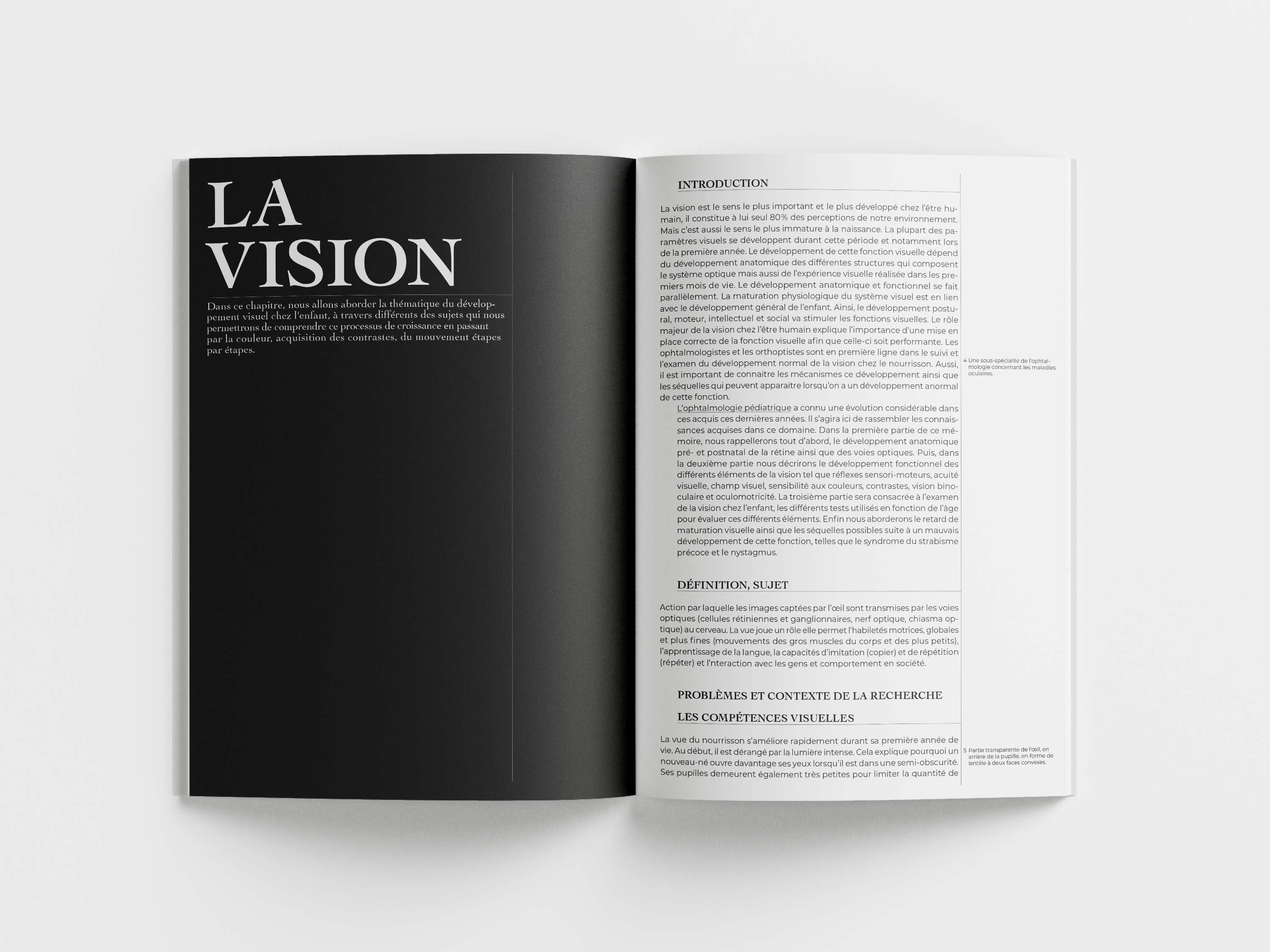 Ce projet permettrait de guider les parents, mais également d’autres publics, à travers des textes analytiques et descriptifs ainsi que des expérimentations visuelles. Il s’articule autour de quatre grands chapitres: la vision, le langage, la motricité et, pour finir, le développement cognitif.