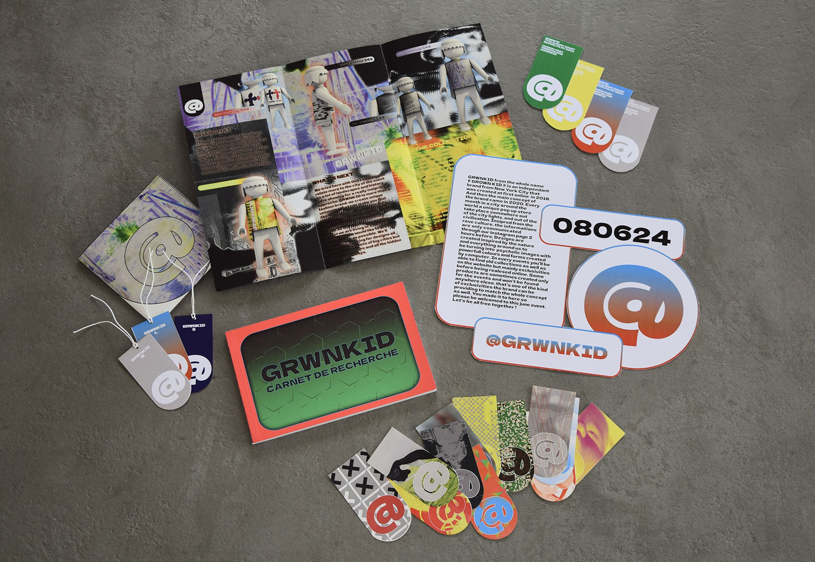 Grwnkid est une marque fictive de vêtements de New York. Elle organise des pop-up stores mensuels dans des lieux insolites, comme des forêts ou des hangars abandonnés, liés à la culture underground des rave parties. Les vêtements affichent des motifs inspirés des paysages et des cultures des villes où se déroulent les pop-ups. Les coordonnées géographiques des événements ne sont dévoilées que deux heures à l’avance pour garder le mystère. Grwnkid conserve son côté underground en étant principalement en ligne et en utilisant Instagram comme plateforme de communication. La marque met en avant le parallèle entre l’âge adulte et l’enfance à travers des visuels abstraits accessibles à tous.