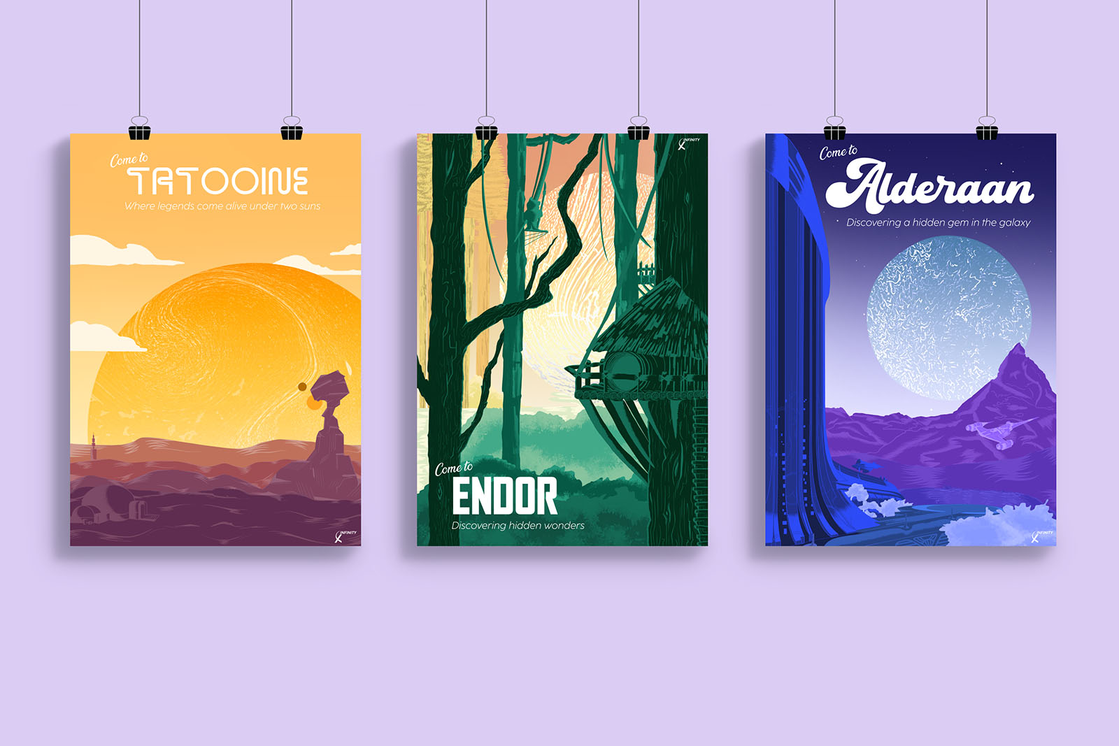 Le concept de cette identité repose sur un travail de textures que j’ai réalisé afin de trouver un style d’images et d’effets cohérents. Ces textures sont omniprésentes et constituent la ligne directrice de mon identité visuelle. Les visuels des affiches s’inspirent des planètes de Star Wars, un monde inconnu en constante expansion, d’où le nom Infinity X. Le choix du format du livret en leporello n’est pas anodin: celui-ci peut également être lu à l’infini, tout comme les petits détails présents dans mes affiches.