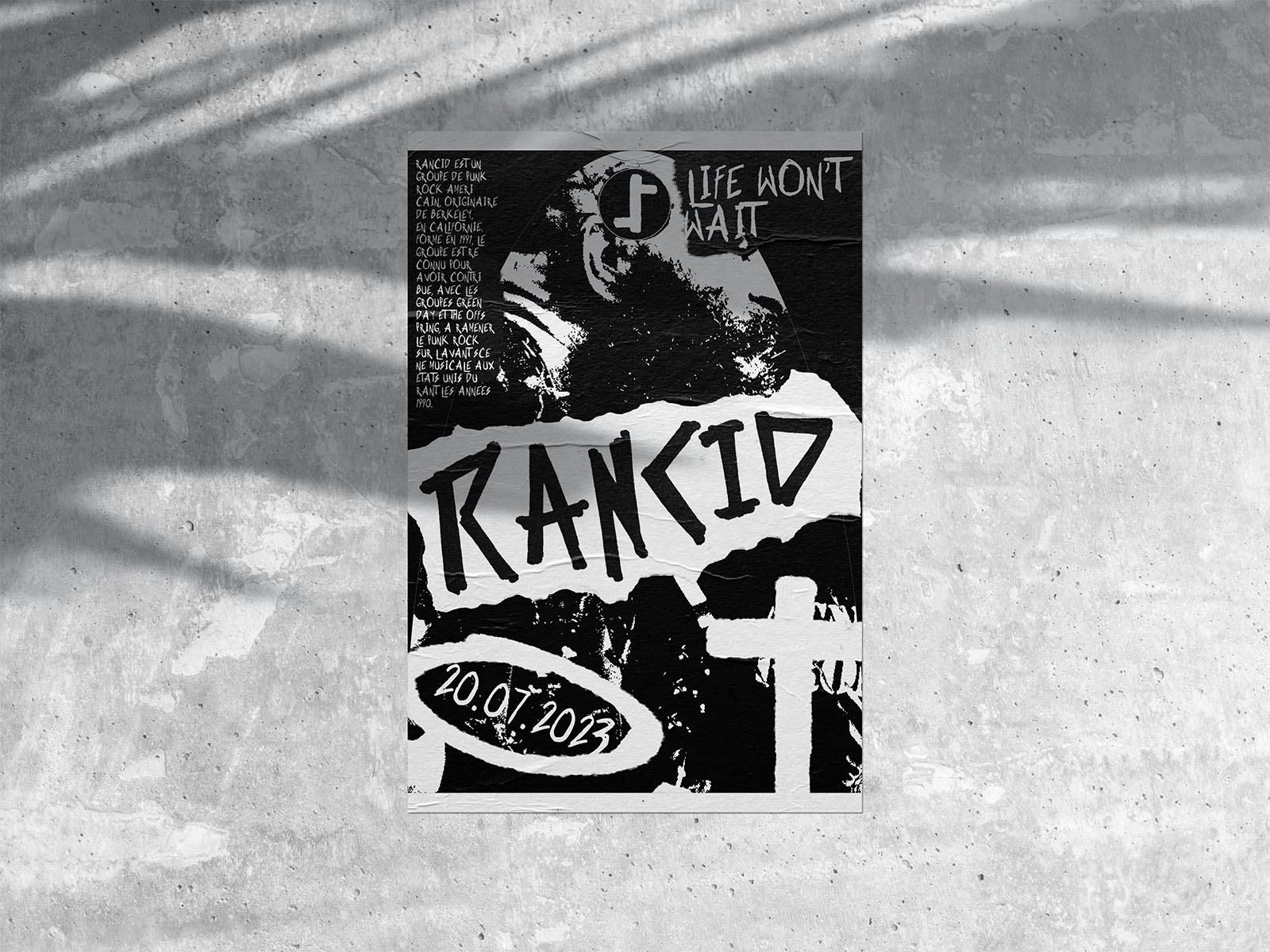 Pour ce projet, j’ai créé l’identité de Fallen Angel, un lieu de culture punk fictif prenant place dans une ancienne église abandonnée. J’ai donc décidé de mixer des éléments esthétiques religieux et des éléments esthétiques punk, en les faisant co-exister sans que cela ne soit dérangeant. Pour le côté religieux, j’ai repris la forme des vitraux, centrée sur les affiches, sur laquelle vient se construire la composition. J’ai également créé des éléments religieux que j’ai intégrés à mes affiches (croix, INRI, etc.). Le côté punk se ressent dans le traitement des images, dans la police d’écriture et dans les autres éléments trash et chaotiques.