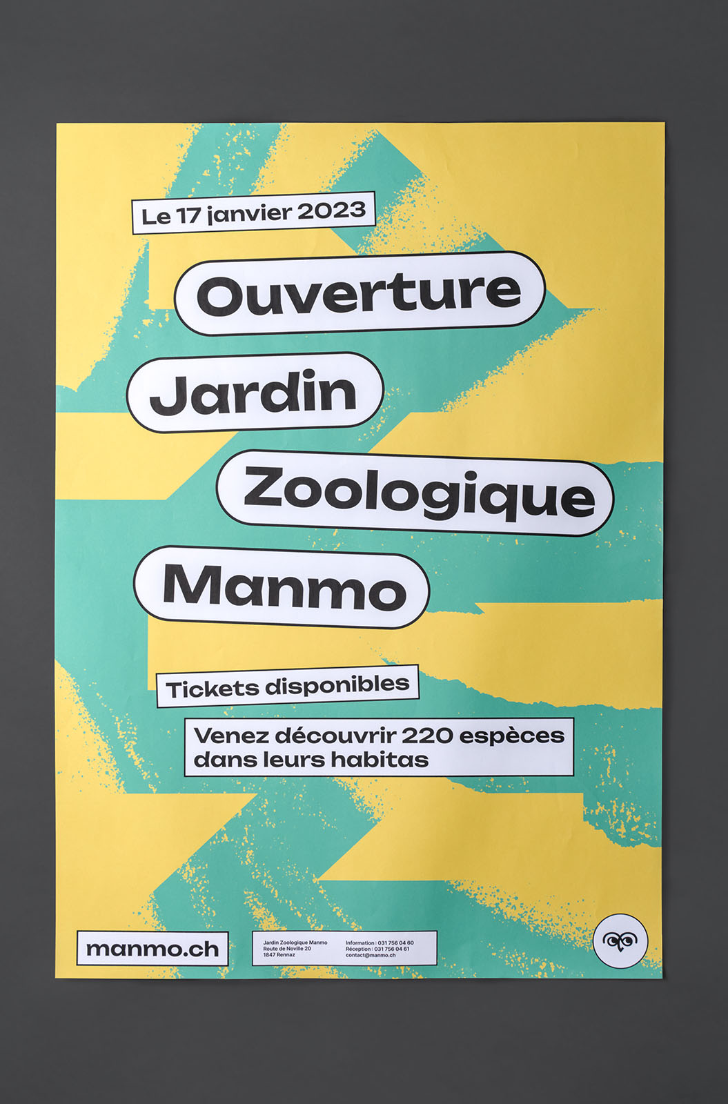 Cette identité visuelle pour un nouveau jardin zoologique fictif dénommé Manmo, situé aux abords de la ville de Villeneuve, a comme but de produire une empreinte forte dans l’imaginaire du public.