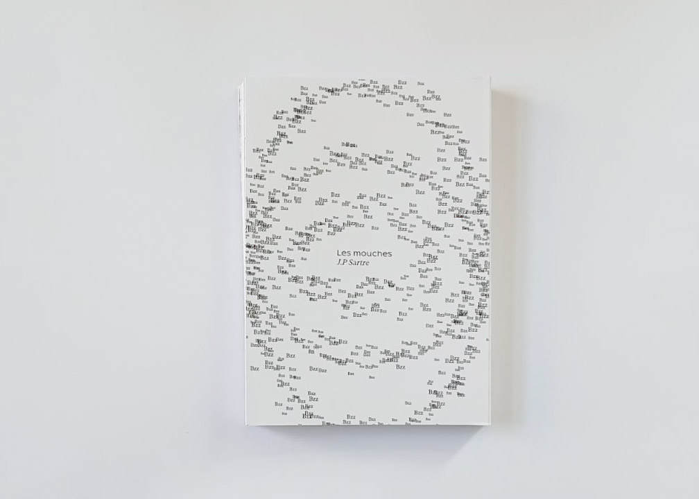 Ce livre met en page la pièce de théâtre Les mouches de manière typographique. Cette oeuvre de Jean-Paul Sartre, écrite durant l’occupation de la France par l’Allemagne, a été jouée pour la première fois en 1943 et est parue en 1947. Elle aborde les sujets de la liberté et du destin, mais de manière plus ou moins dissimulée pour faire face à la censure. C’est pourquoi ce livre prend la forme d’un leporello avec une face cachée, où les lettres, qui représentent les mouches, viennent empiéter sur le texte de l’autre côté. Dans le texte, les mouches représentent la culpabilité ou les remords et infestent la ville.