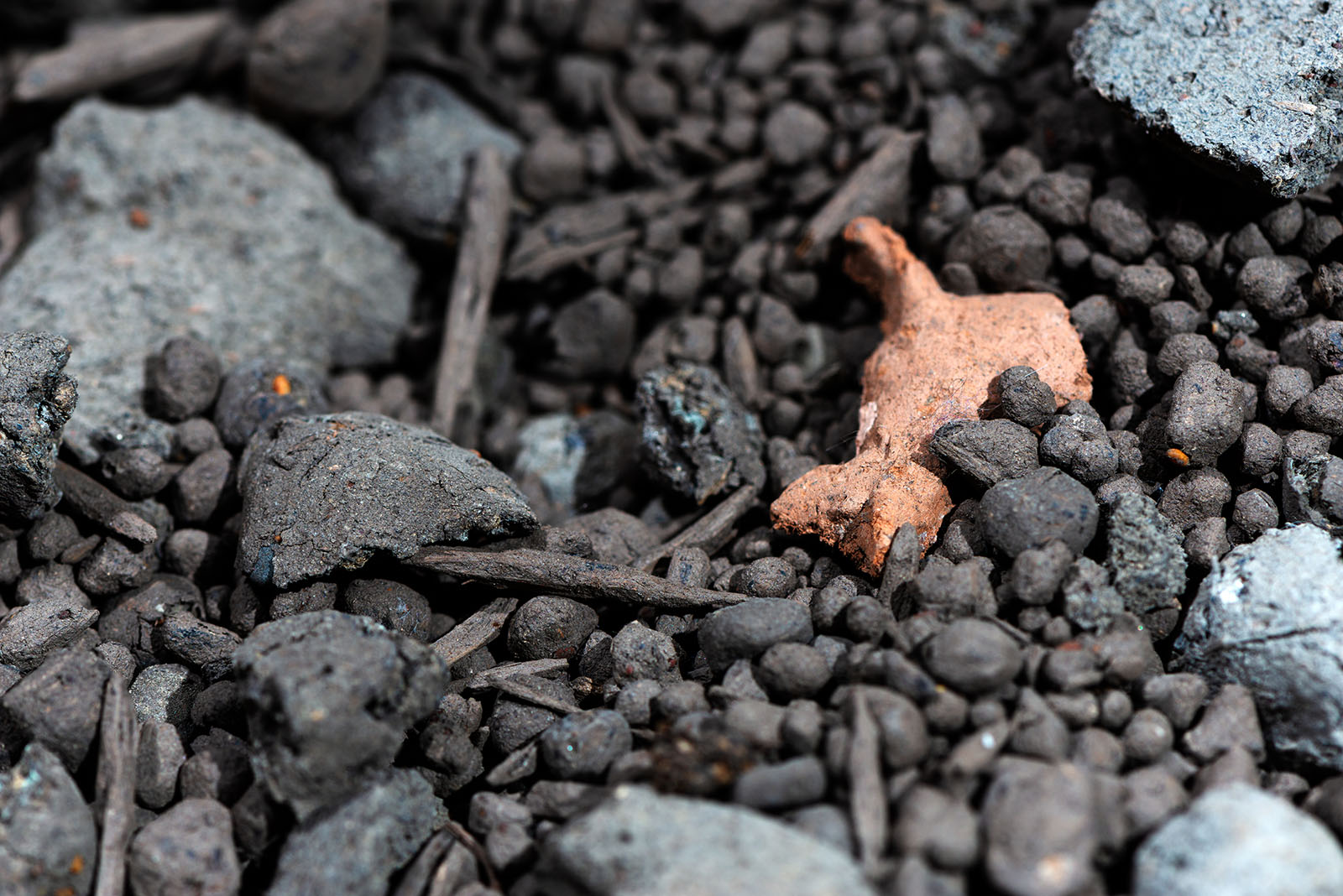 La sculpture est un amas de terre fragmenté et recomposé au pied d’un pilier du lieu d’exposition. Ces mottes de terre renferment des graines qui représentent une biodiversité plus ou moins habituée à pousser sur des sols désolés.