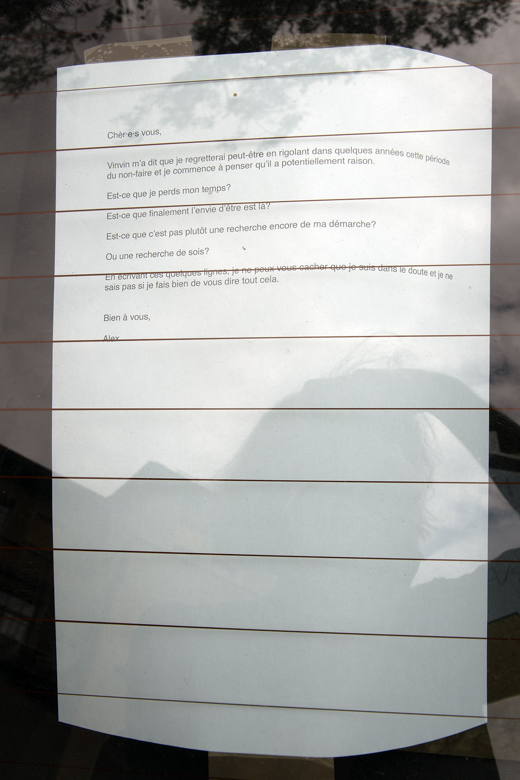 Le projet Je ne suis et ne serai pas réunit un nombre indéfini de lettres d’essais de refus d'être artiste. Exposées dans ma voiture, elles racontent, entre autres, mon rapport au faire et au non-faire, ma paresse, mes états d'esprit et mes questionnements sans fin. Jouant sur l'ambiguïté, l'humour et l'amertume, j'invite le spectateur à parcourir mes pensées et à se questionner lui-même sur son propre rapport aux choses qui l'entourent.