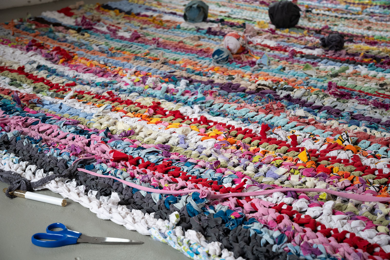 Installation, tapis, dimensions variables, pelotes de tissus recyclés, 2024