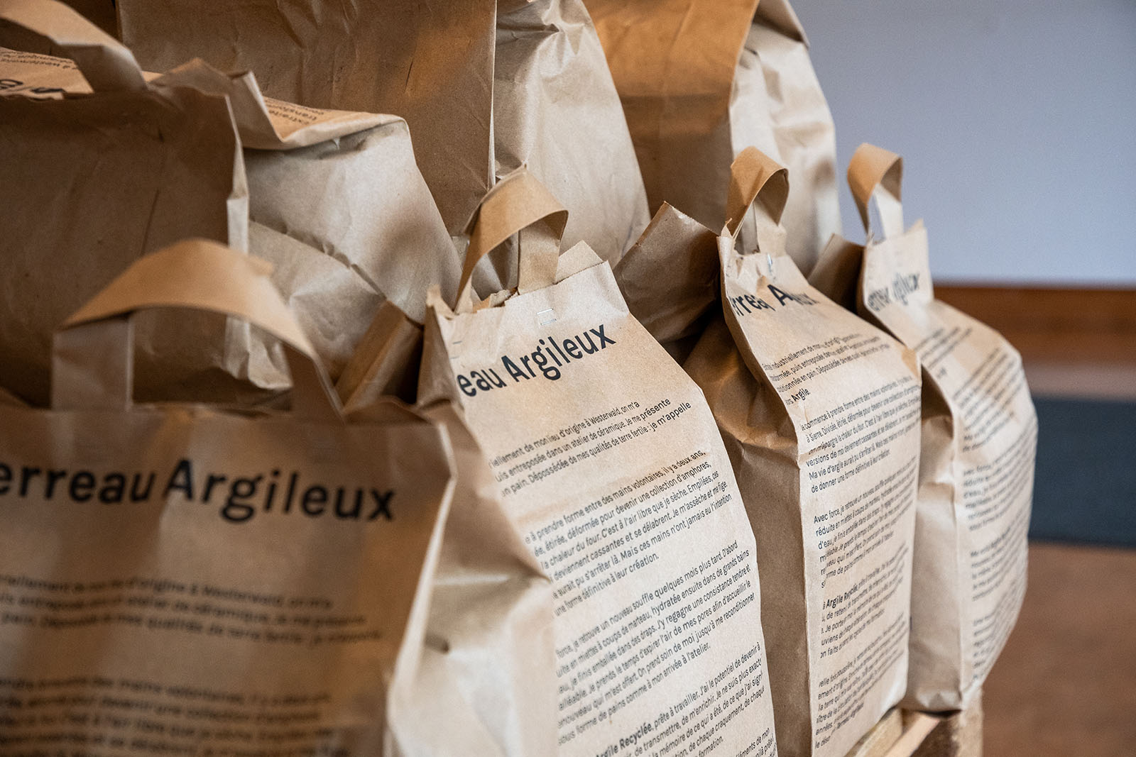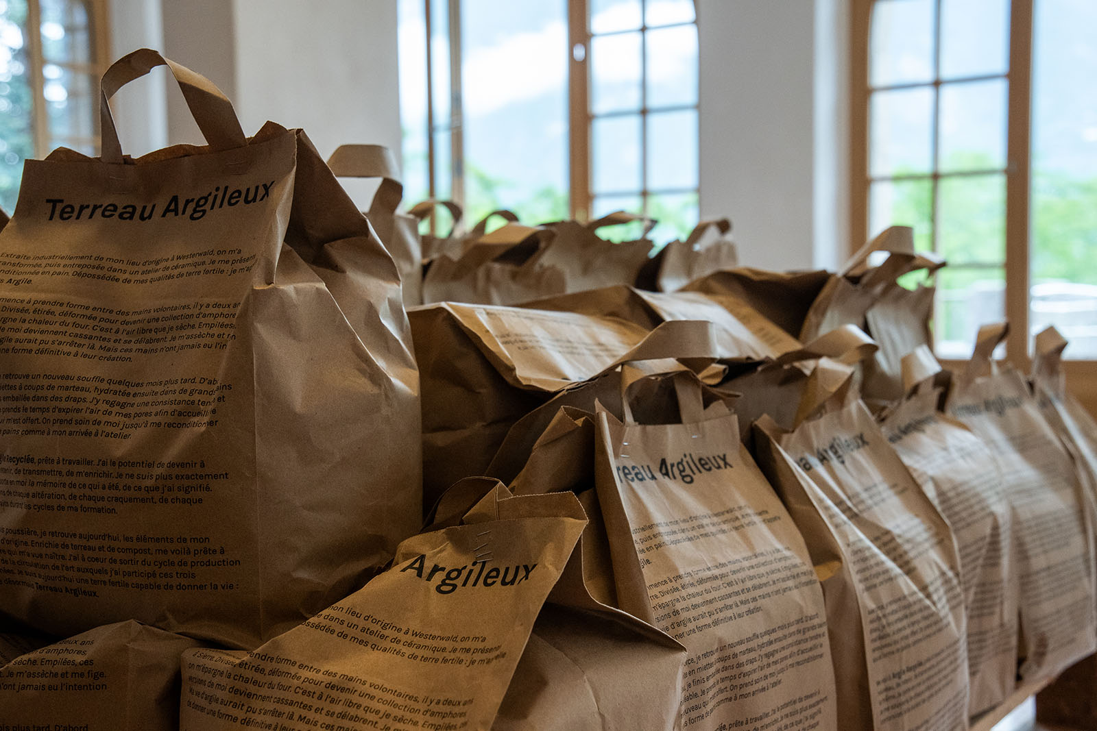 Installation, argile recyclée, terreaux, compost, sacs papier, sacs plastiques, fils, dimensions variables, 2024