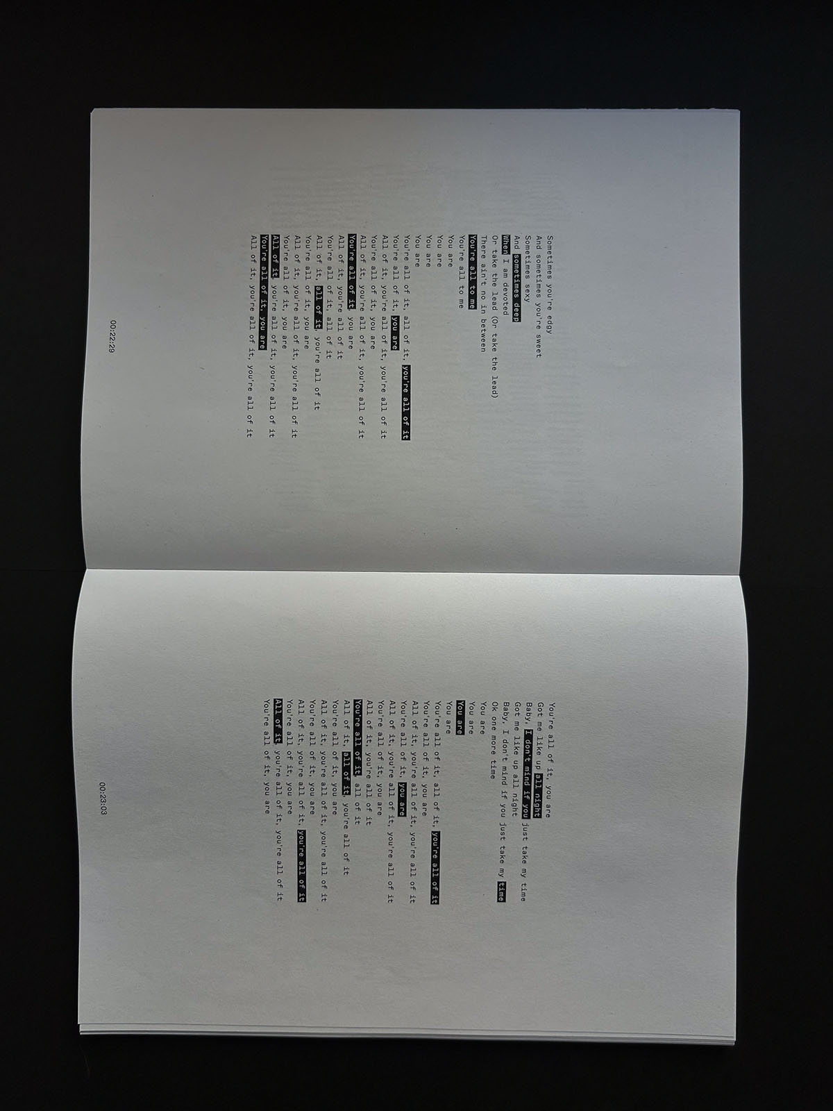 Concept of time est une expérimentation graphique de musiques analysées grâce à différentes notions que l'on retrouve dans le domaine du tatouage, telles que la vitesse, la durée ou encore l'intensité.