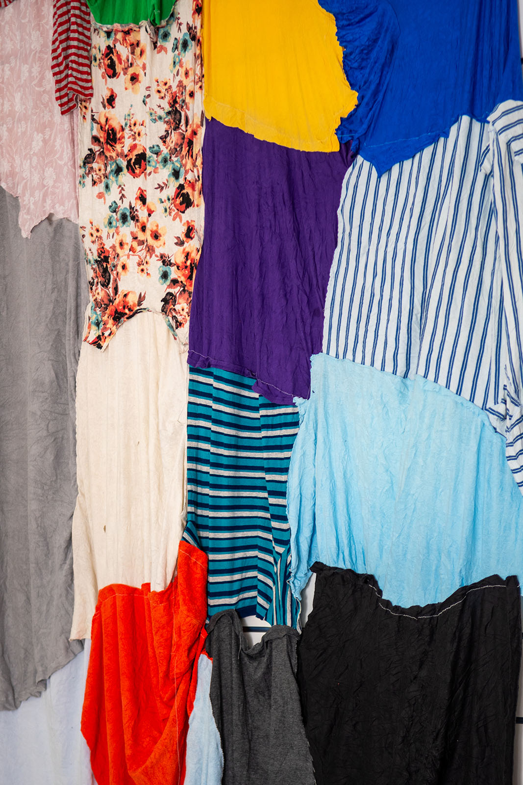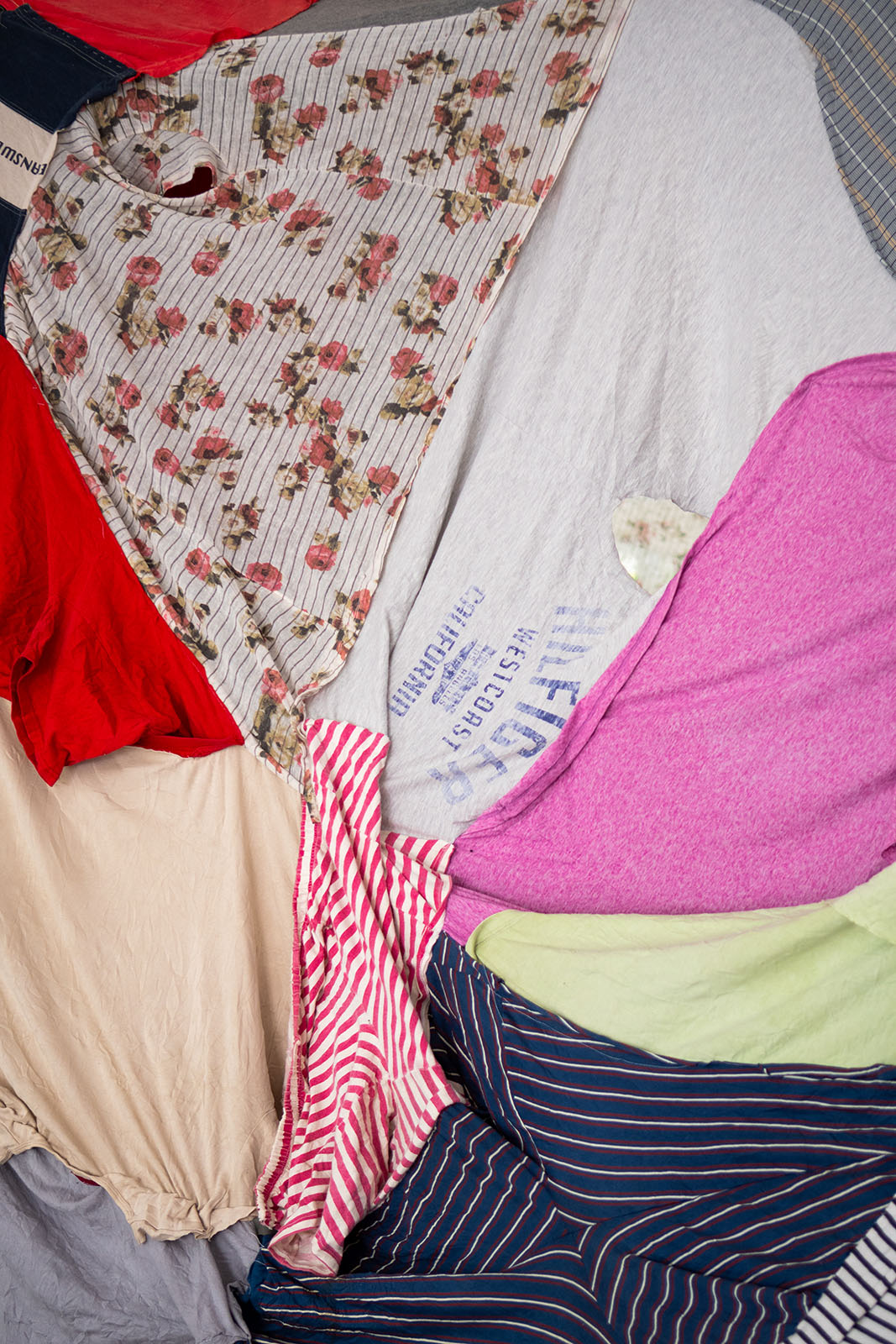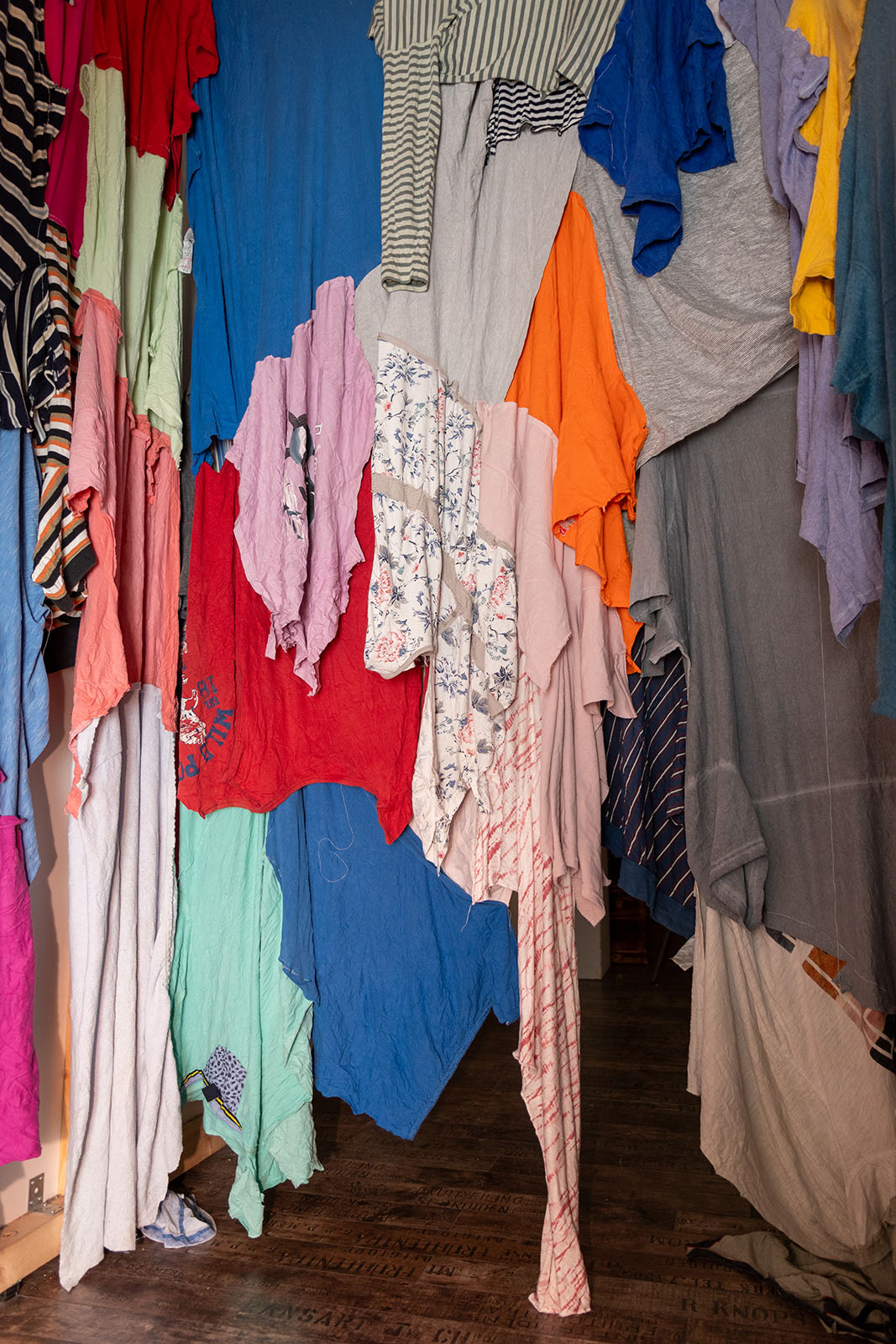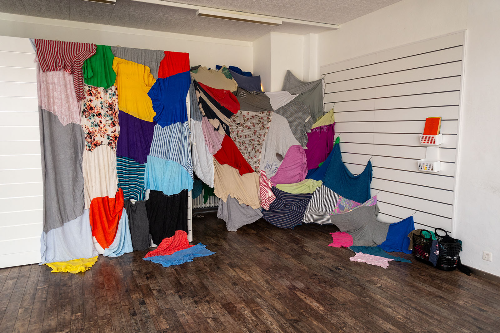Chiffons multicolores, deux lampes frontales, traduction du texte de la performance imprimée sur papier, aiguilles et fils à disposition, 2025