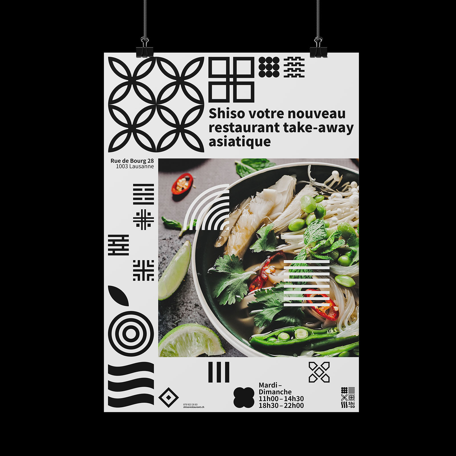 Shiso est un restaurant asiatique fictif basé à Lausanne. Il propose diverses recettes provenant de différents pays d’Asie. L’établissement permet un voyage dans plusieurs cultures en un seul repas grâce à un choix de goûts variés. Shiso met également à disposition un service take-away simple grâce à ses boîtes qui peuvent s’adapter aux plats. L’identité visuelle se base sur les différents motifs décoratifs que nous pouvons retrouver dans les pays d’Asie. Elle les adapte, les simplifie et les assemble côte à côte en jouant avec leur taille.