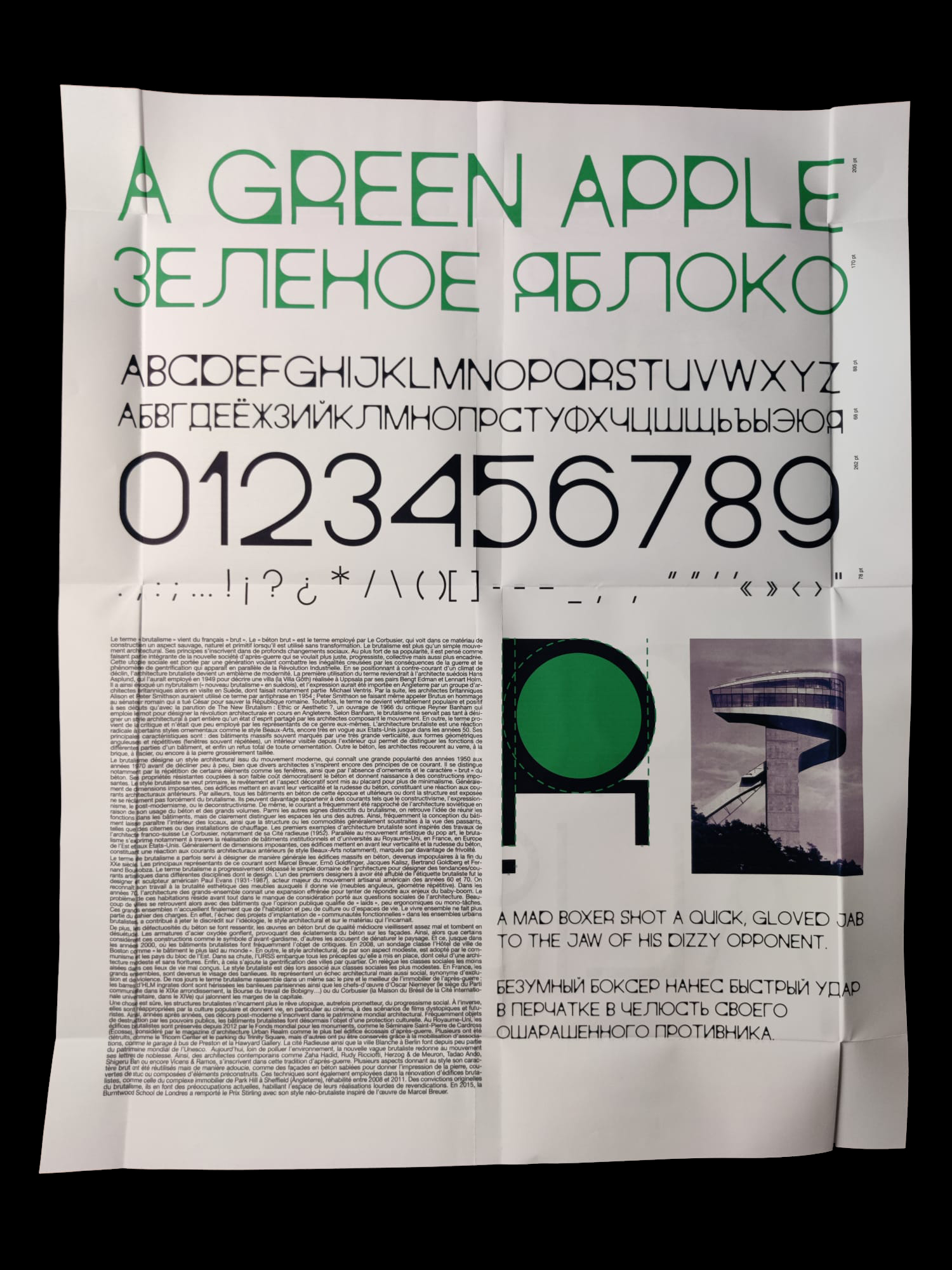 J’ai travaillé sur la création d’un livre et d’un spécimen autour d’une typographie sur les alphabets latin et cyrillique basée sur le brutalisme. J’ai pour cela récolté des images d’architecture de ce style qui font penser aux lettres des deux alphabets et soulignent les étapes de la création de la typographie. L’ouvrage comporte des définitions de chaque style architectural qui a précédé le brutalisme et de ceux qui en sont dérivés, ainsi qu’une explication de l’importance et de l’identité de la typographie.