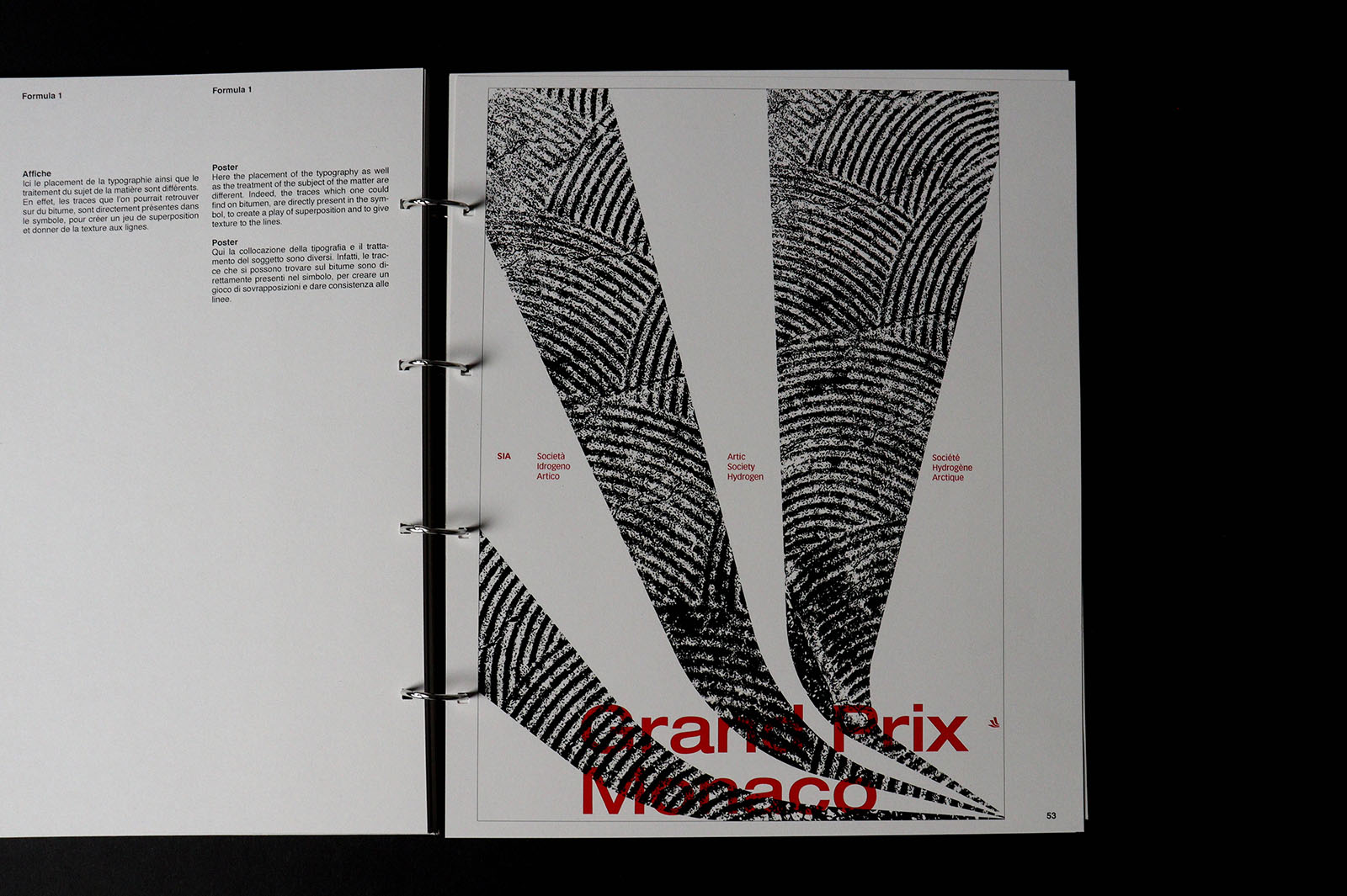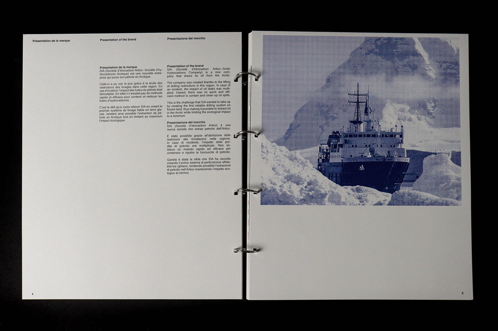 Ce projet présente l’identité visuelle de SIA, une nouvelle entreprise pétrolière fictive située en Arctique et qui aurait pu exister grâce à la levée des restrictions des forages dans cette région. De nos jours, le pétrole a une connotation négative car il va à l’encontre des enjeux climatiques. L’objectif de ce travail est d’imaginer une façon de rendre attractives cette société et ses idées novatrices, à travers une identité visuelle qui pourrait s'appliquer aux différents types de supports ainsi que plusieurs séries d’affiches. Il faut noter que SIA possède également une écurie de Formule 1.