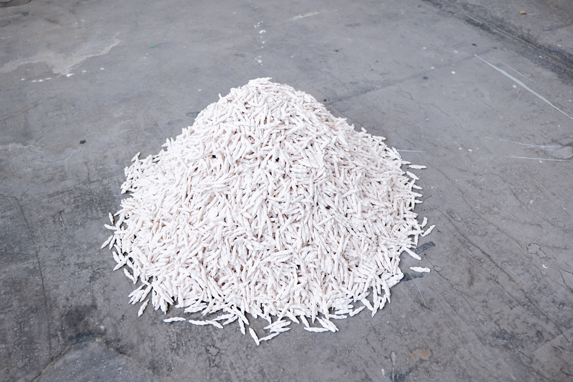 Installation, porcelaine, plâtre, bois, métal, papier (3 × 5 × 3 m), 2022