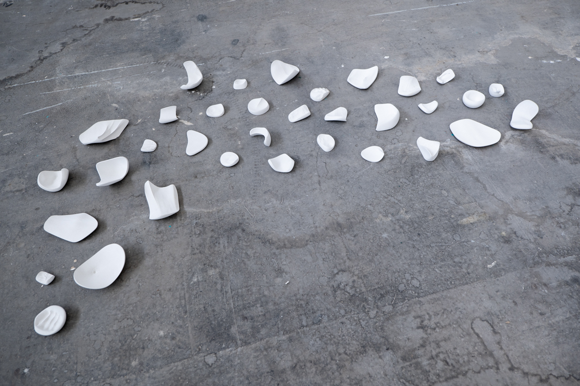 Je pars du geste. Et je fais sans arrêt. 1 – Répéter un même geste pendant des heures; produire des milliers de pièces en serrant des bouts de porce-laine dans mes mains –> obsession, mal de dos, ennui; malgré tout devenir dépendante de ce geste. 2 – Boîte, LED: l’argile comme trace d’un moment; sublimer cette trace –> archives, effacement, mémoire. 3 – Derrière le geste: le corps –> frag-menté, imparfait, précieux. 4 – Penser le geste avec des mots; définition du dictionnaire –> n.m. mouvement du corps révélant un état d’esprit ou visant à exprimer, à exécuter quelque chose. S’exprimer par gestes –> n.f. ensemble de poèmes épiques du Moyen Âge relatant les exploits d’une héroïne. Chanson de geste.