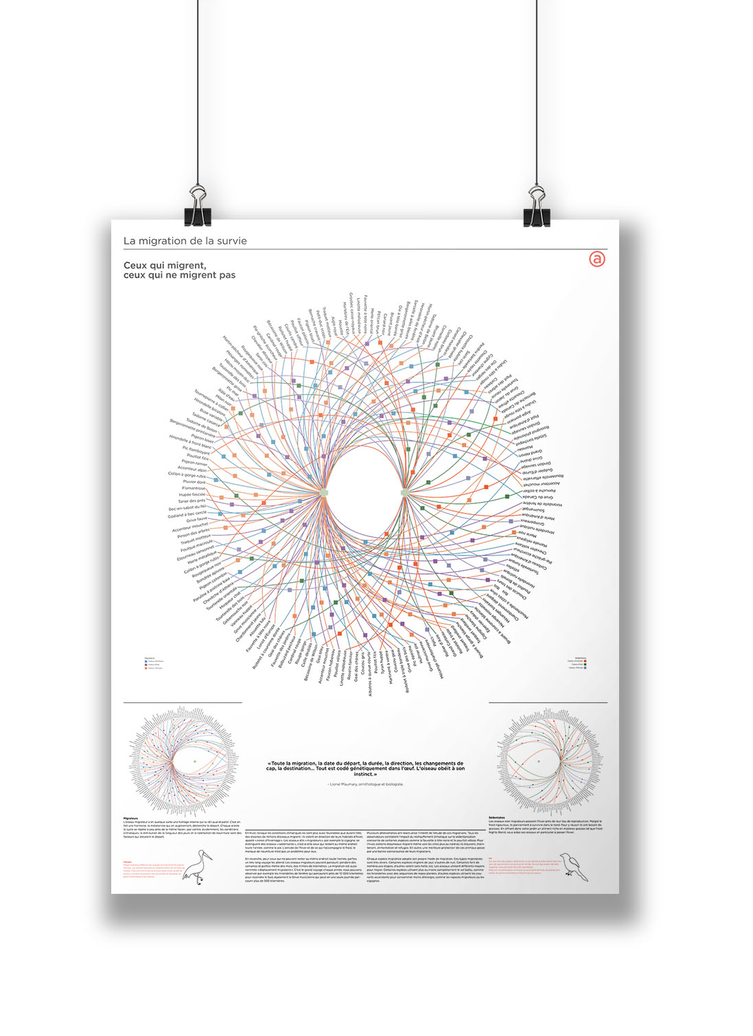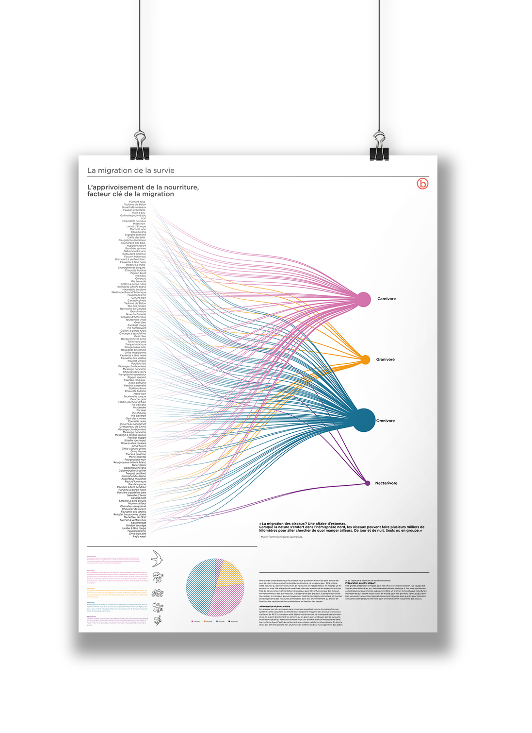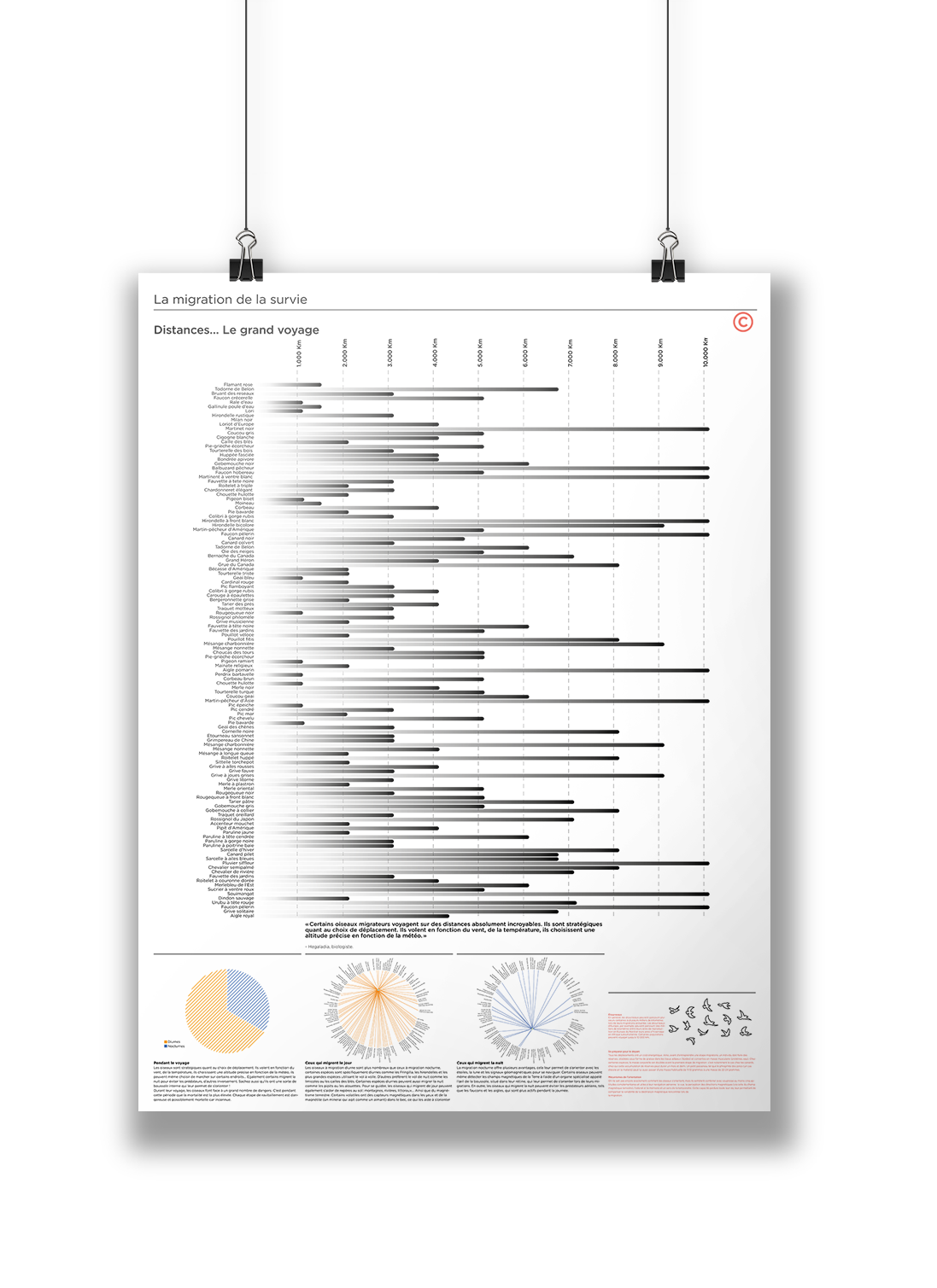 Deux fois par an, les oiseaux migrateurs parcourent de longues distances entre leurs sites de reproduction et leurs quartiers d’hiver, guidés par leur instinct de survie et la recherche de nourriture. En explorant ce sujet, j’ai découvert des informations intéressantes sur les raisons de la migration, les caractéristiques des espèces, leur alimentation, leur reproduction, etc. Pour rendre ces données plus accessibles, j’ai créé trois affiches composées d’infographies, de textes informatifs et d’illustrations. Cela permet de faciliter la compréhension de ce phénomène complexe tout en mettant en valeur le graphisme. Les oiseaux, avec leur diversité de formes, de couleurs et de tailles, offrent une source visuelle riche pour ce projet.