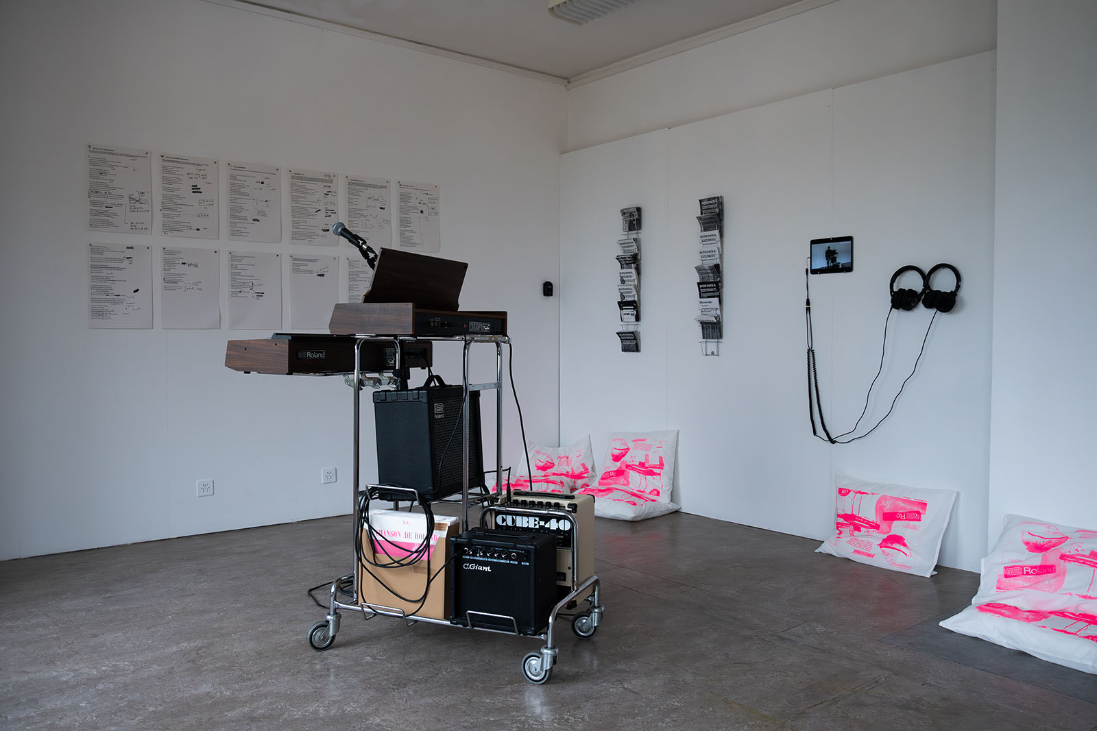 Installation, matériel musical, chariot, affiches, éditions, archives, dimensions variables, 2024