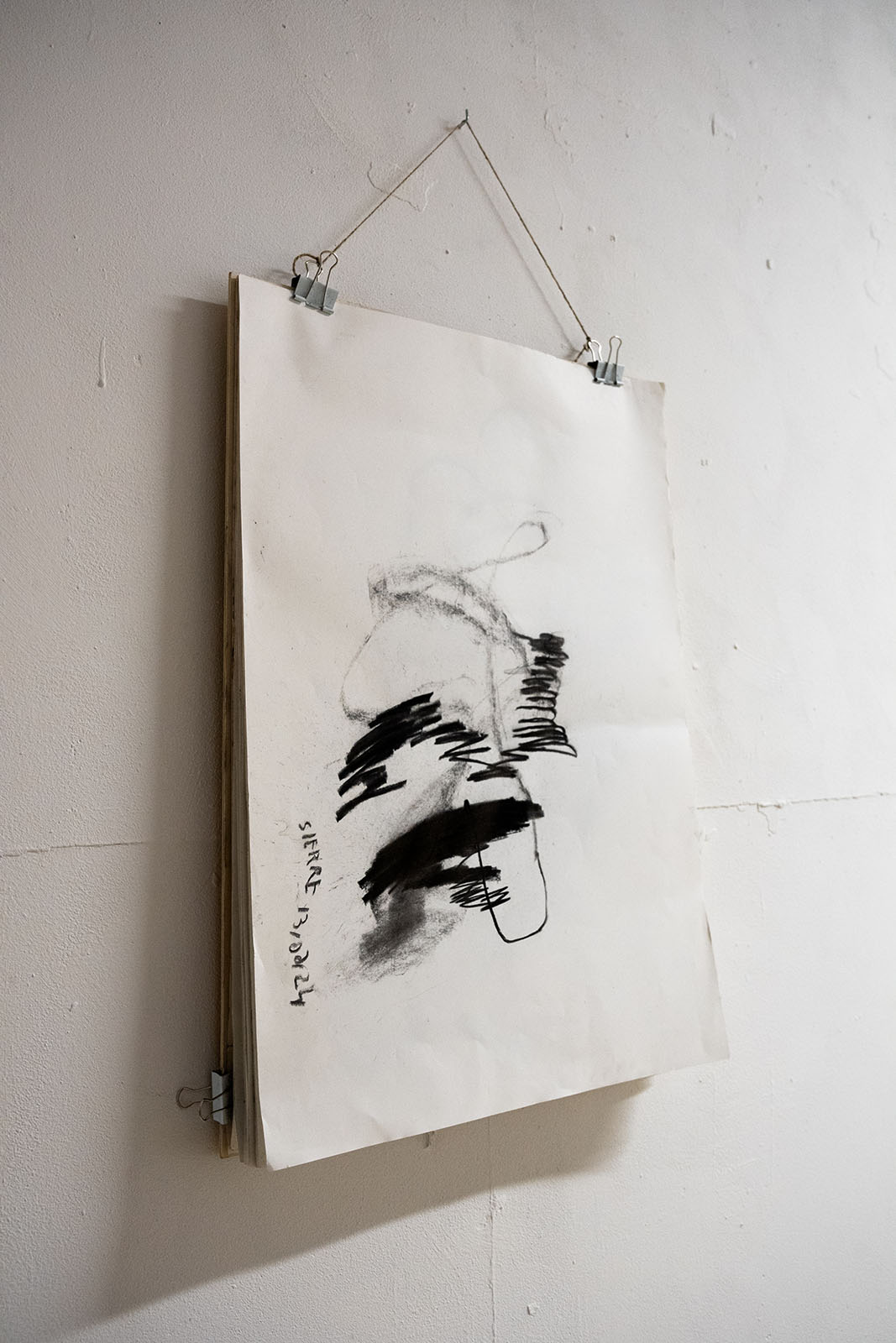 Un microphone de contact sur un fusain et une main qui l'utilise comme un plectre de guitare sur une feuille blanche.