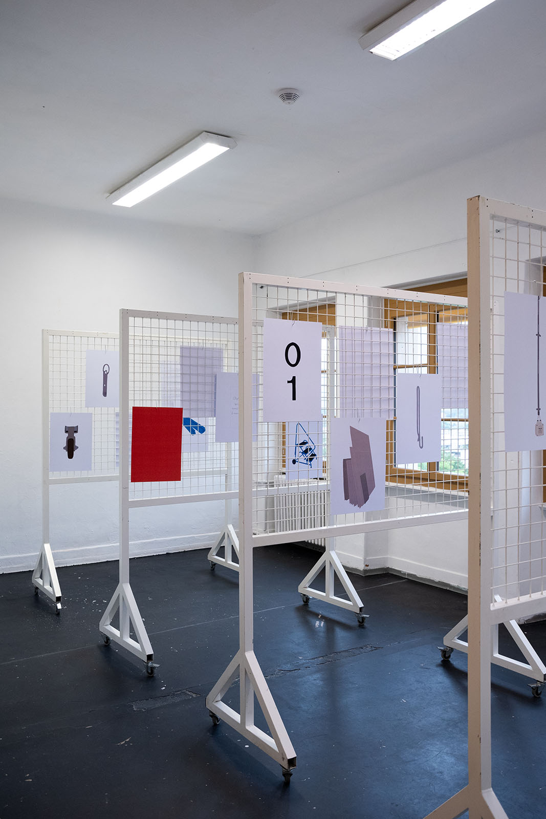 Impressions, dessins numériques, grilles d’exposition, crochets, dimensions variables
