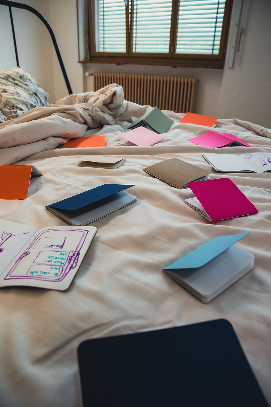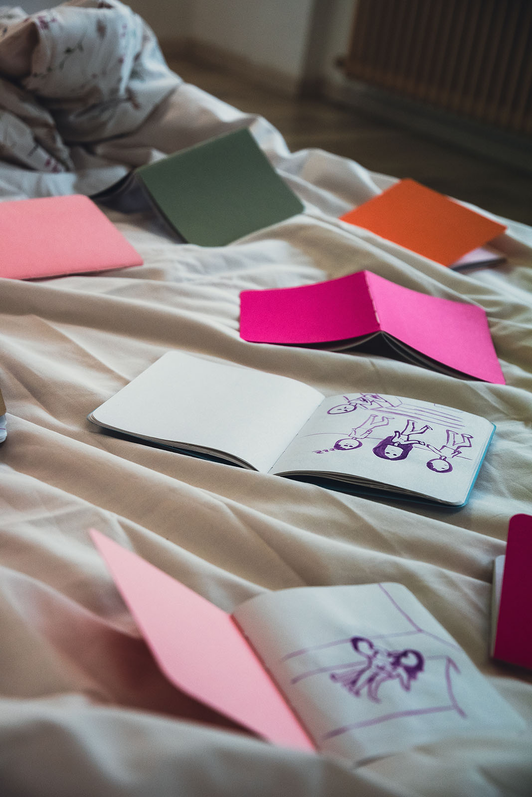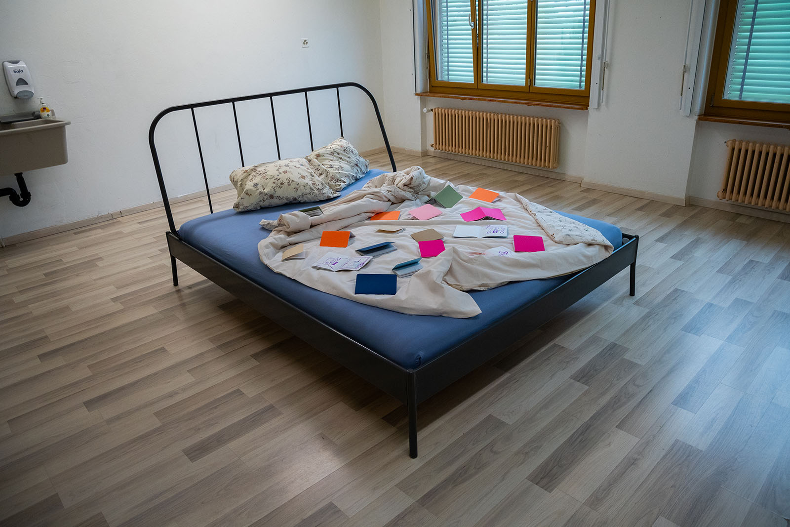 Installation, lit, carnets de feuilles de dessins, env. 160 × 200 cm, 2024
