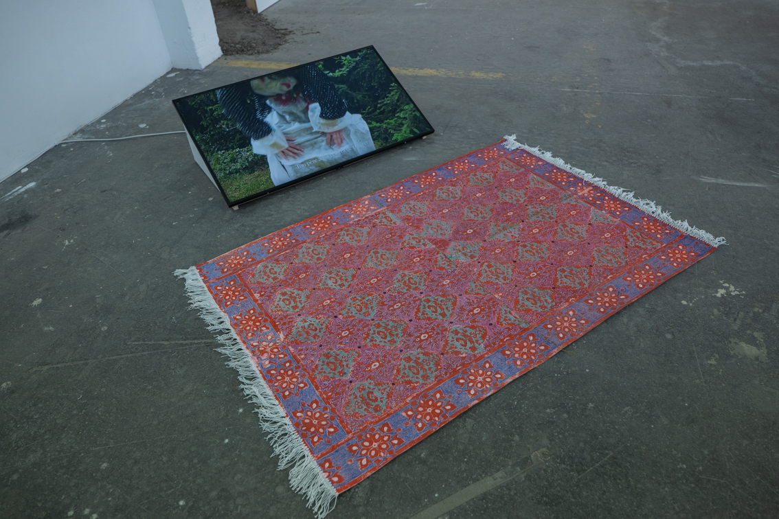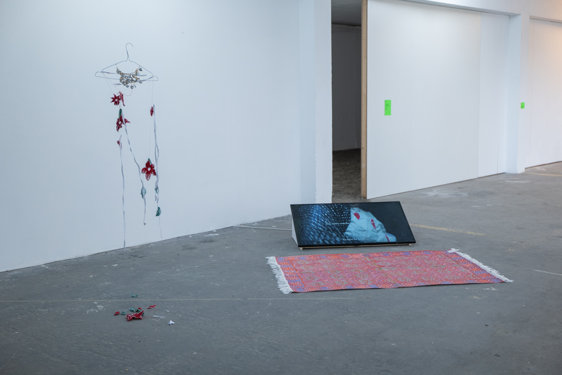 Il s’agit d’une recherche identitaire à travers la fabrication et la transformation. Je recrée un tapis, une tenue et un collier. La réalisation manuelle de ces éléments est lente, mais leur métamorphose est presque instantanée. La robe s'allège de "ce qui n'était plus si précieux". Le tapis se recouvre d’empreintes résultant d’un geste simple mais indélébile, comme un échange ou une discussion.