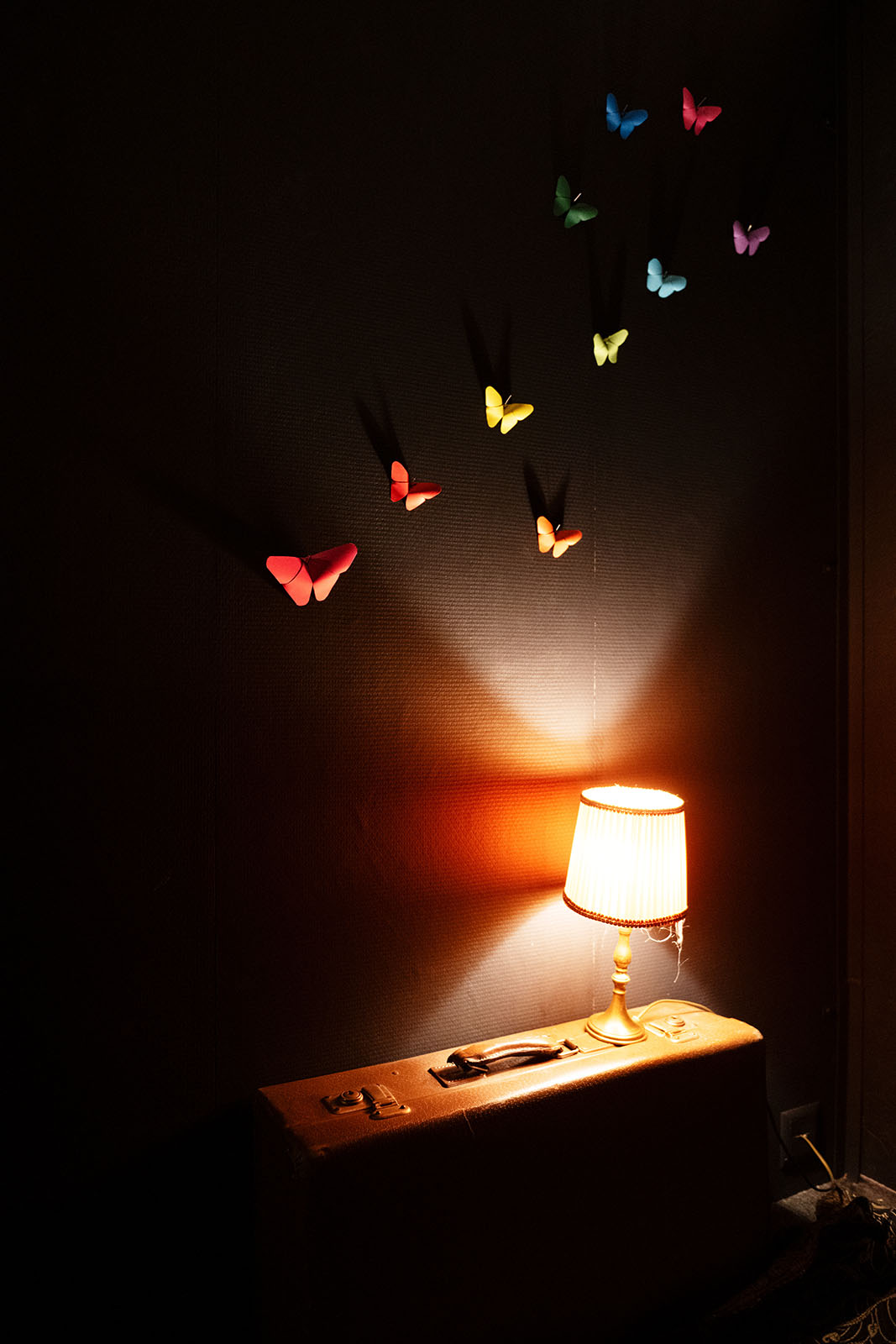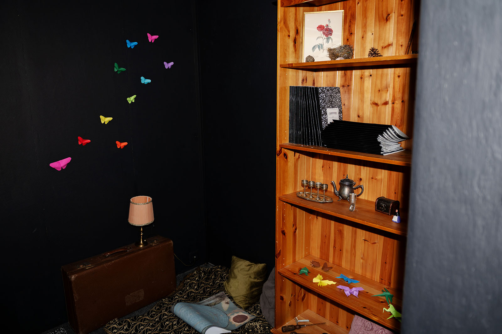 En franchissant le seuil, nous entrons dans un espace qui évoque autant l’ici que l’ailleurs. Un bureau, lieu de travail d’une amie imaginaire. Elle s’y recueille pour écrire son histoire.