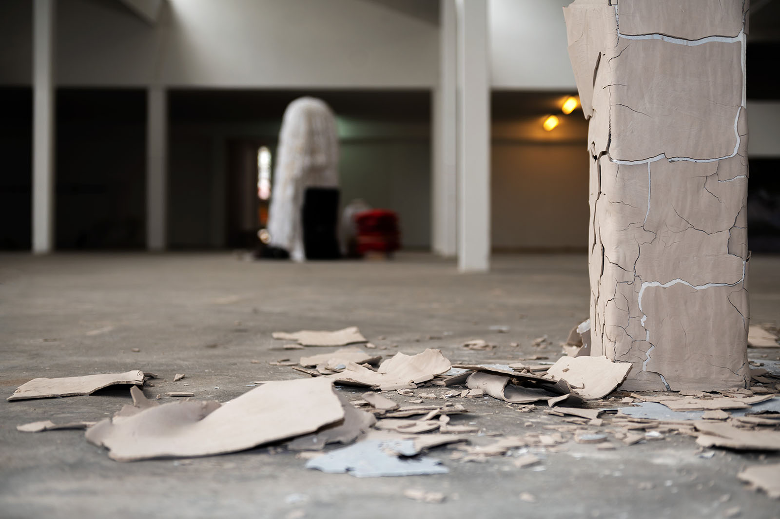 Pour ce projet, l’artiste a souhaité panser un pilier d’Usego. Mais la carapace d’argile qu’elle y a apposée et qui tombe symbolise l’inutilité de renforcer un système qui s’effrite déjà. Le craquèlement du revêtement, qui se produit avec le temps, peut être considéré comme une métaphore de la société.